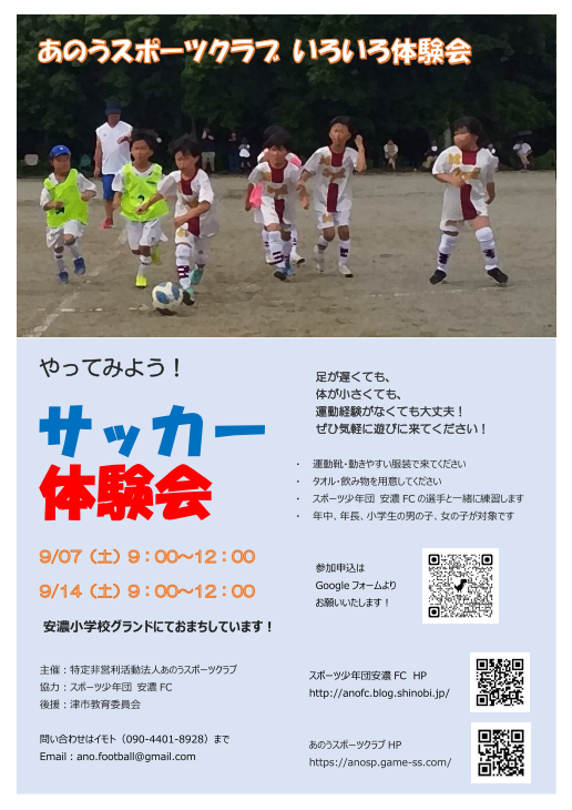 あのうSC×安濃FC サッカー体験会のお知らせ