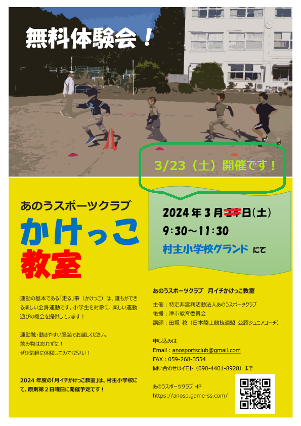 3/23(土)月イチかけっこ教室 無料体験会のお知らせ 今月の月イチかけっこ教室は 3/23(土)9:30-11:30 @村主小学校グランド にて開催させていただきます。 来年度のかけっこ教室は会場が村主小学校に変更になる予定なので、無料体験会とさせていただきます。 たくさんのご参加をお待ちしております。 各小学校に配布させていただいたチラシの日付に間違いがありました お詫びして訂正いたします。