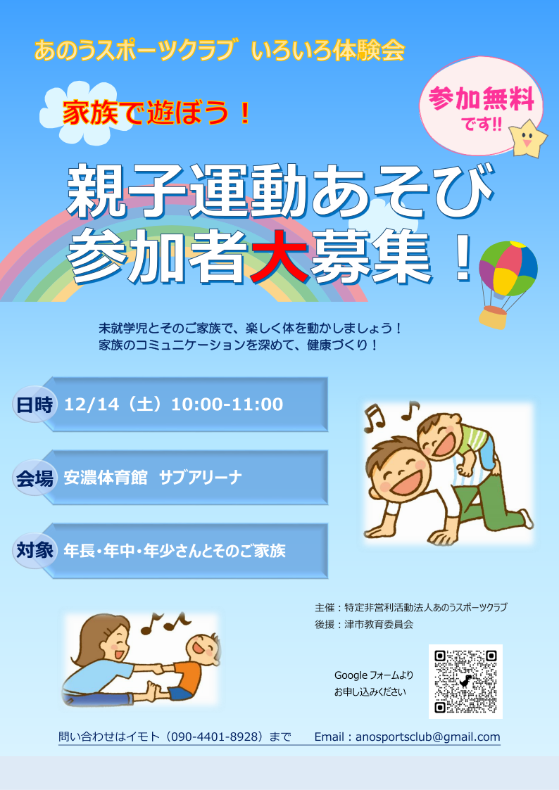 親子運動遊び体験会、ありがとうございました。 12/14、安濃体育館サブアリーナにて「親子運動遊び体験会」を開催しました! 親子で体をほぐして 先生も頑張る! およそ20組、50名+先生が参加。 サブアリーナを走り回って、ご家族でできる運動遊びを楽しんでいただきました! これからも地域の皆さんに楽しんでいただけるイベントを企画していきたいと思います! みなさま、ありがとうございました。 PR