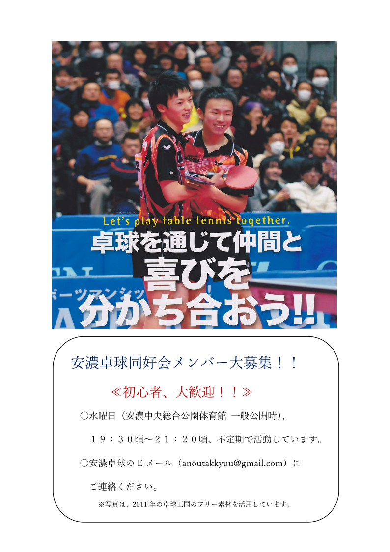 ちなみに、安濃卓球同好会は、水曜日の夜、7時半頃から9時すぎまで、安濃体育館サブアリーナにて、不定期で活動しています。