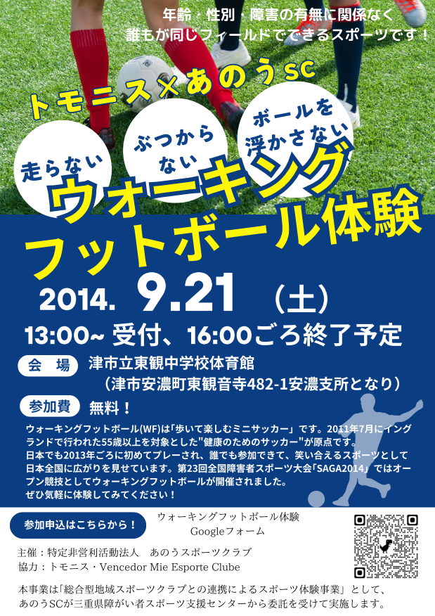 9/21(土)東観中学校体育館をお借りして、トモニスさん・Vencedor Mie Esporte Clubeさんとウォーキングフットボール体験会を開催しました。