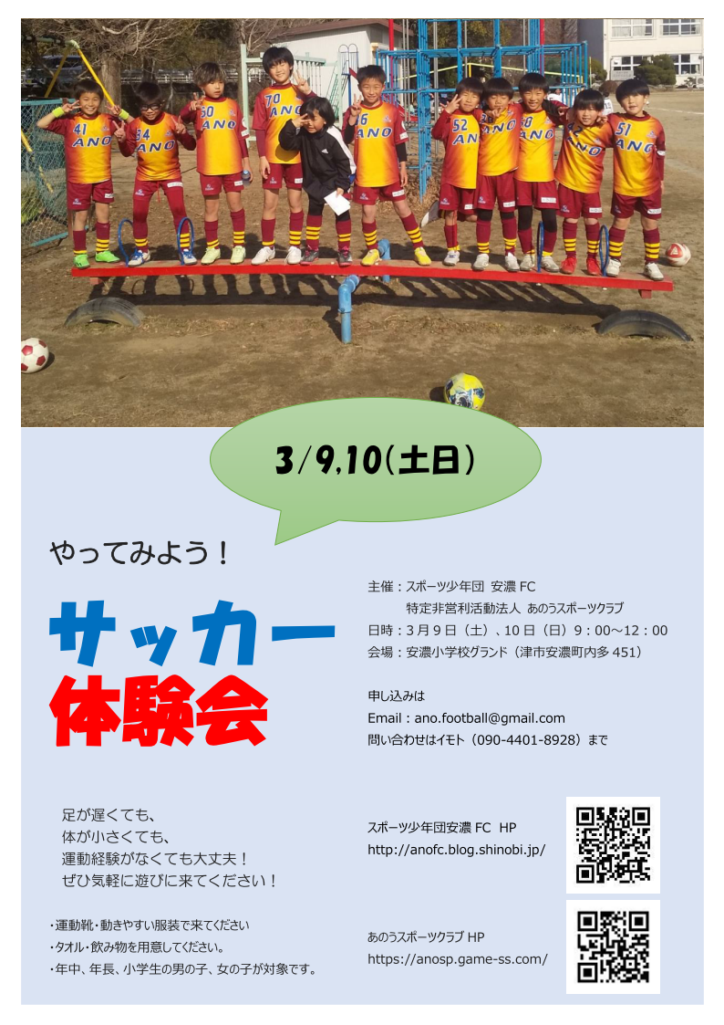 3/9,10(土日)サッカー体験会のお知らせ サッカー体験会のお知らせ 3/9(土)9:00~12:00 3/10(日)9:00~12:00 安濃小学校グランドにて、サッカー体験会を開催します! スポーツ少年団 安濃FCの子どもたちと一緒に、楽しくサッカーしましょう! 運動靴・動きやすい服装・タオル・飲み物を用意してください。 年中、年長、小学生の男の子、女の子が対象です。 スポーツが経験なくても、体が小さくても、足が遅くても大丈夫です。 皆様のお越しをお待ちしております! 問い合わせはトップページのメールフォームからお気軽にどうぞ。 PR