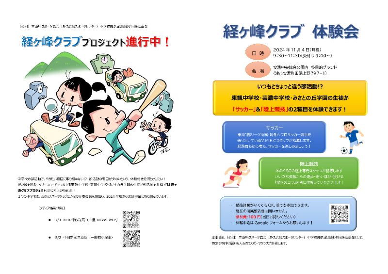 11/4(月祝) 経ヶ峰クラブ体験会(部活動地域移行実証事業) 11/4(月祝)秋晴れの良いお天気の元、経ヶ峰クラブ体験会を開催しました! これまで実施してきた実証事業は、バス移動で3校が集合し、顧問の先生が指導されるという内容でしたが、今回は学校外部の指導者を迎えての体験会になります。 陸上競技の部には、みさとの丘学園の野球部の皆さんが参加。 投げる・走る、といった『動きのコツ』を体感していただきました。 サッカーの部には、東観中サッカー部と芸濃中学校の生徒が参加。 東海一部リーグ参入が決定した、Vencedor Mie Esporte Clubeの現役選手の指導を受けました。 東観中学校のHPでも早速記事にしていただきました! この先の部活動地域移行(地域展開?)がどのように進むのか、津市においては全く不透明な状況です。 廃部の危機にある部活動が、たくさんあります。 大人がモタモタしてる間に、中学生は卒業しちゃいます。 我々にできることは限られていますが、将来の子供たちにとってよい環境を作れるよう頑張っていきたいと思います。 この事業は(公財)三重県スポーツ協会(みえ広域スポーツセンター)中学校部活動地域移行推進事業として、特定非営利活動法人あのうスポーツクラブが主催しました。 お世話になった関係者の皆様、ありがとうございました。