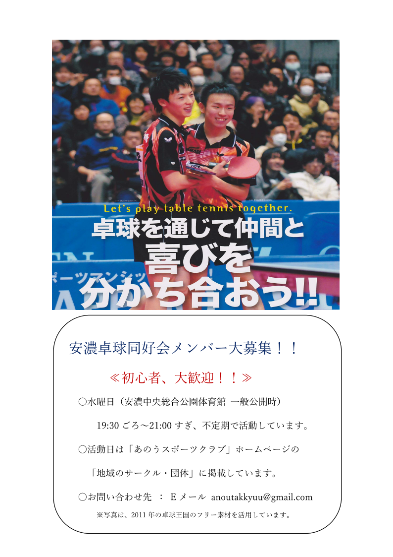 安濃卓球同好会 1月の活動予定 安濃卓球同好会の1月の活動予定です。 1月8日(水)、1月22日(水) 安濃中央総合公園内体育館にて、19:30ごろ~21:00すぎに活動しています。 ぜひ気軽に参加してください。 連絡先/anoutakkyuu@gmail.com